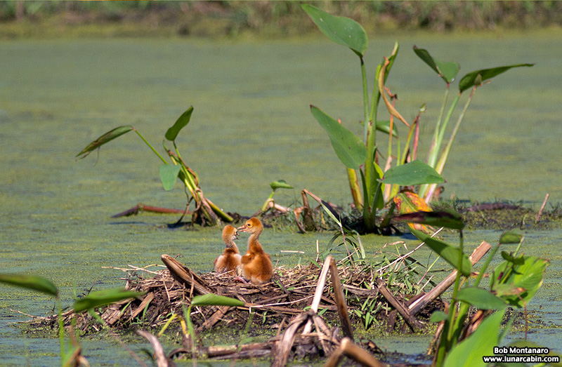The vigil is over. The Sandhill Cranes nesting on the little island in the wetlands at Treasure Hammock Ranch have hatched out two chicks — or to impress your birding friends with the proper lingo, young Sandhill Cranes are called “colts”. Here are some images and personal observations from the past two days.