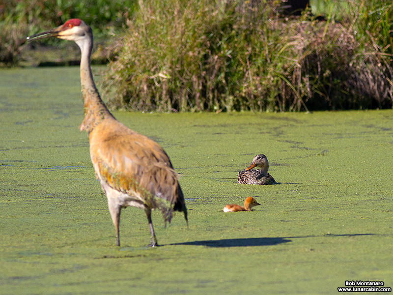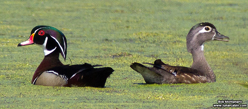 Besides the Mottled Ducks keeping the Sandhill Crane family company, a good number of Wood Ducks are currently making themselves at home in the wetlands. The male Wood Duck is the showy one at left while the female is at right.