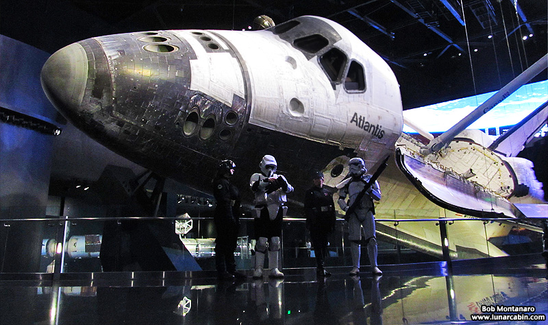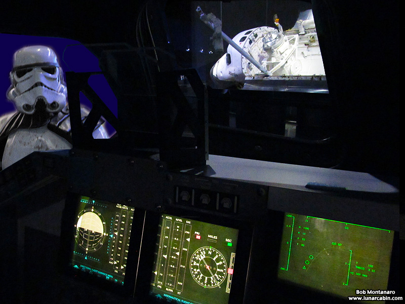 Inside the Shuttle Cockpit Simulator during the performance, with Atlantis out the front window and a Stormtrooper looking in.