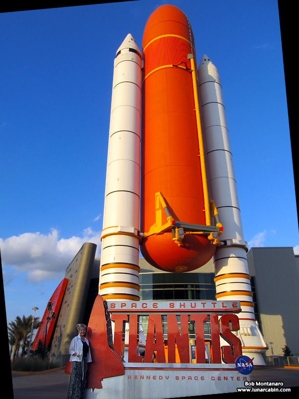 Susan Boyd, fellow concertgoer, poses in front of the entrance to the Space Shuttle Atlantis exhibit with the External Fuel Tank and Solid Rocket Boosters towering overhead.