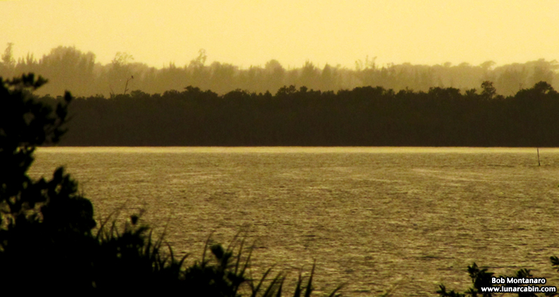 A brief moment of golden light suffuses the landscape during a rainstorm at sunset in this view looking across the Indian River Lagoon toward Pelican Island National Wildlife Refuge. Look carefully. That black speck atop a snag in the distance is an Osprey. A hawk enamored of fish, which it eats to the exclusion of almost anything else. Ospreys at the Refuge and I go back a long way together.