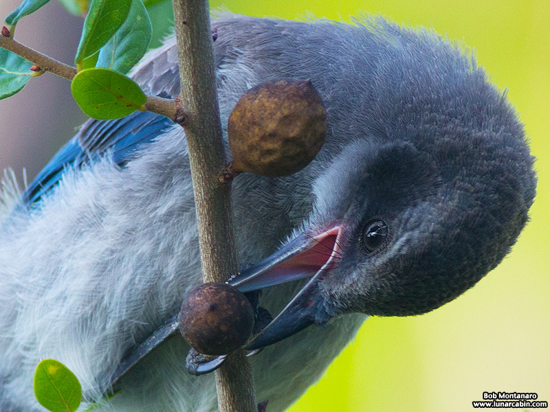 The Brownheads, children of the Florida Scrub-Jay couple at the Indian River Club, are growing quickly and are now about the size of their parents. But their main passion is food, which they can’t get enough of, either from their parents or what they can find for themselves like this Brownhead trying unsuccessfully to get this gall off of a Myrtle Oak. The parents know best and bring insects aplenty to the Brownheads who need a big protein boost at this stage in their life to help them grow. (Thank you to Janice Broda, writer and photographer of the wonderful ORCA blog, for identifying the gall, which I thought was an acorn.)