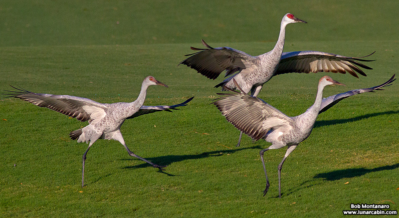 Seeing the two juvenile Sandhill Cranes and their parents made for a pleasant surprise. It was nice to see the two juveniles are surviving into adulthood. Here the two juveniles, in the foreground, burn off a lot of energy as they race across the golf course accompanied by an adult. We have been watching the family grow over the past few months.