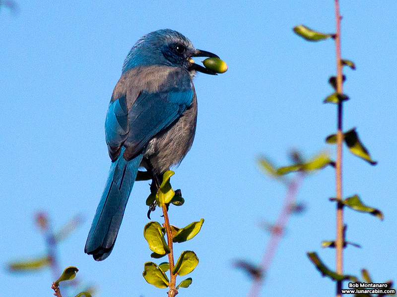 A Florida Scrub-Jay with an acorn perches atop a tree.