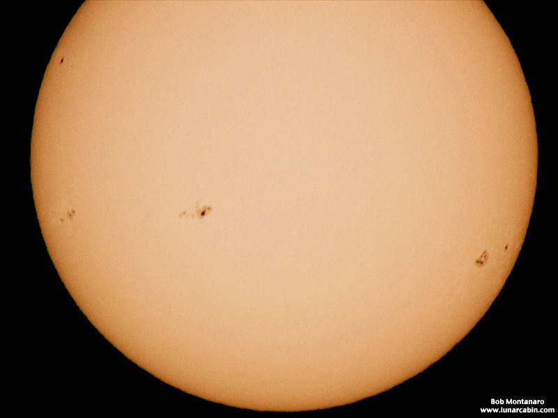 Last Friday our local newspaper featured a story about the giant sunspot, one of the largest in recorded Sun watching, that had rotated back into view after being out of sight on the far side of the Sun for a couple of weeks. The Sun rotates on its axis like the Earth but because it is a ball of plasma different parts rotate at different speeds. The average rotation is about 25 days so with most sunspots lasting from hours to only a few days, this long lasting one seemed a bit special so I planned on trying to get a photo of it. As luck would have it Friday was cloudy, which dragged on through the weekend, finally giving way to partly cloudy skies on Monday allowing me to finally try and get a photo through the swiftly moving gaps in the clouds. Needless to say, it was more cloudy than clear so it got to be a bit exasperating waiting on trying to get a shot. Then, much to my disappointment, when I finally saw the sunspot it was not much to look at since it had dissipated considerably over the weekend. But here are two of the photos I took this afternoon between 1:00pm and 2:00pm, one a bit of a close-up, the other a full disk image of the Sun. Interestingly, there appears to be a lot of sunspot activity on the Sun currently. As an aside, the images were taken from the parking lot of the Audubon House, where construction is nearing completion for Pelican Island Audubon Society’s new nature center at the Oslo Riverfront Conservation Area on Oslo Road in Indian River County, Florida.