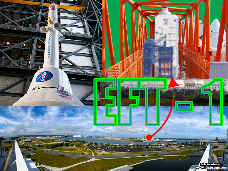 Exploration Flight Test-1 of NASA’s new Orion spacecraft built to take astronauts back to the Moon and someday to Mars is less than a day away from launch now — weather and technical issues notwithstanding. Liftoff is scheduled for 7:05 a.m. on 4 December 2014. The images show a panorama of Port Canaveral as seen from atop the Port’s new Exploration Tower with cruise ships at left and the United Launch Alliance Delta IV Heavy rocket that will launch Orion, highlighted by the red line, on the horizon. A long distance view taken from Exploration Tower shows Space Launch Complex 37 with the three orange boosters of the Delta IV Heavy strapped side-by-side tucked safely inside the Mobile Service Tower. To honor Apollo 11 and the eventual return to the Moon in Orion, the orange walkway swing arm used to access the Apollo 11 space capsule is in the background behind the Mobile Service Tower. The swing arm is on display at the Kennedy Space Center Visitor Complex. The image at upper left is an Orion engineering test article for developing ground servicing procedures in the Vehicle Assembly Building.