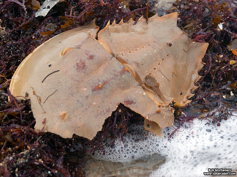 The broken carapace of a Horeshoe Crab washed up with the seaweed.