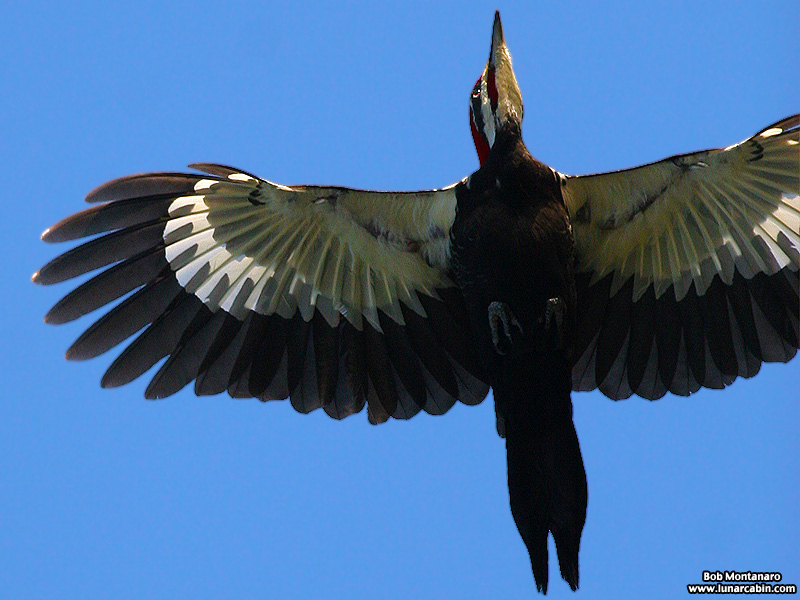 A male Pileated Woodpecker (Dryocopus pileatus) swoops up into a tree at Pelican Island National Wildlife Refuge. According to the Cornell Lab of Ornithology, the average wingspan of a Pileated Woodpecker is 26–29.5 inches (66–75 cm). The average body length is 15.7–19.3 inches (40–49 cm).