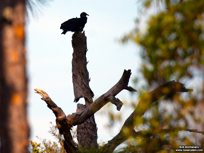 Photos from the FMEL-ORCA conservation stewardship class walk through the overgrown South ORCA scrub on Saturday afternoon, 7 February 2015. I did not hold out much hope of seeing birds, which kept the class focus on the plants, but was happily surprised to see this Black Vulture (Coragyps atratus [Coragyps, “raven vulture” in Greek; stratus, dressed for mourning]) perched atop a dead tree trunk. Note the gaping hole in the trunk, most likely caused by a Woodpecker cavity rotting out.