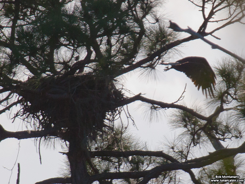 One of the Eagles returned to perch near the nest, which can be seen as the black bulk in the pine tree.