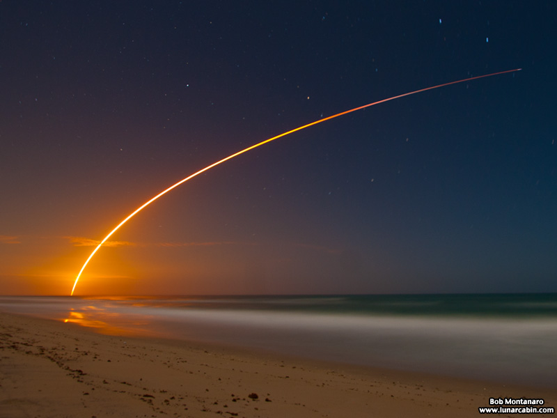 A SpaceX Falcon 9 rocket launches two communications satellites into orbit at 10:50 p.m. from Cape Canaveral on 1 March 2015 in this time exposure taken from the beach just south of Sebastian Inlet State Park under bright moonlight. More at http://www.lunarcabin.com/Rocket_Launches/abs_eutelsat.html