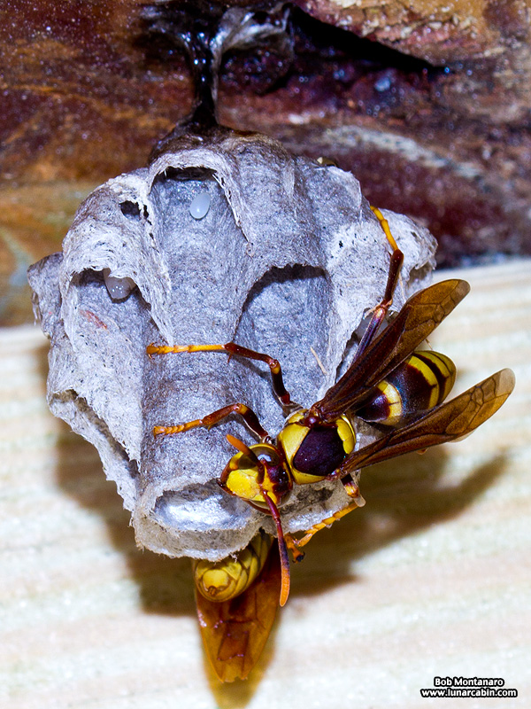Two images from of the activity around the Paper Wasp nest at Audubon House from Saturday. The wasps seemed a bit somnolent in reaction to the chilly and rainy day with none of them venturing out from their cozy cover and out into the bad weather. Lucky for them, warmer days are ahead.