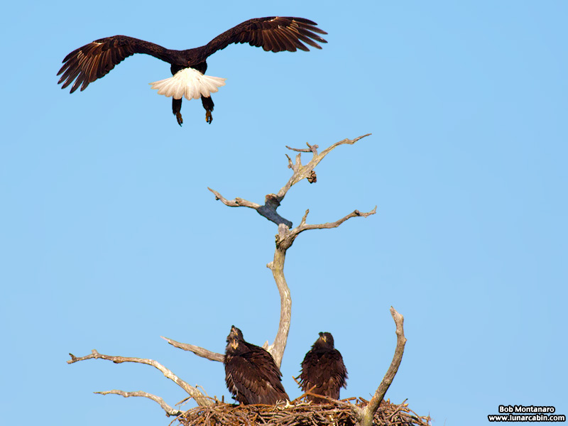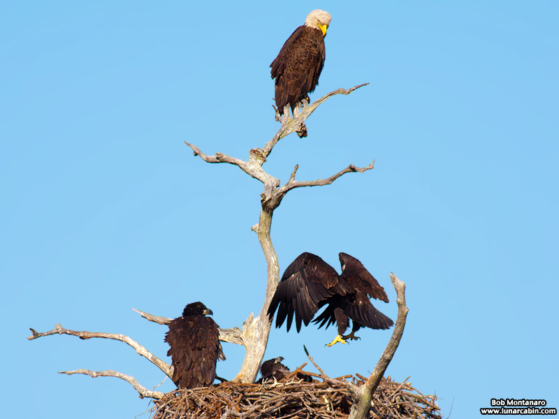 The three Eagle nestlings are rambunctious and their large size makes the nest seem a crowded place. They were also observed feeding themselves from food the adult Eagles had brought to the nest.