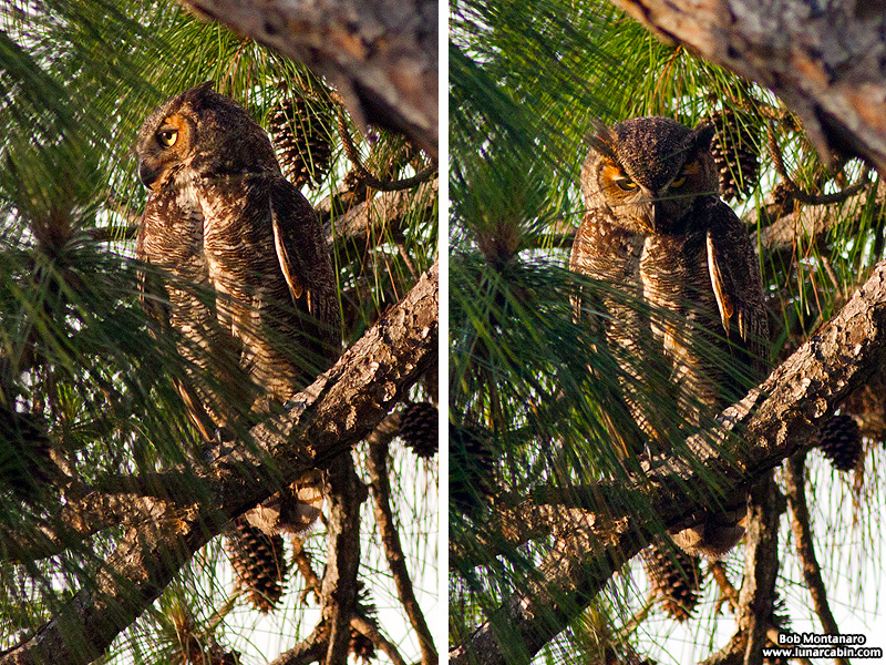 Two of the Great Horned Owl young in the brief outpouring of morning sunlight.