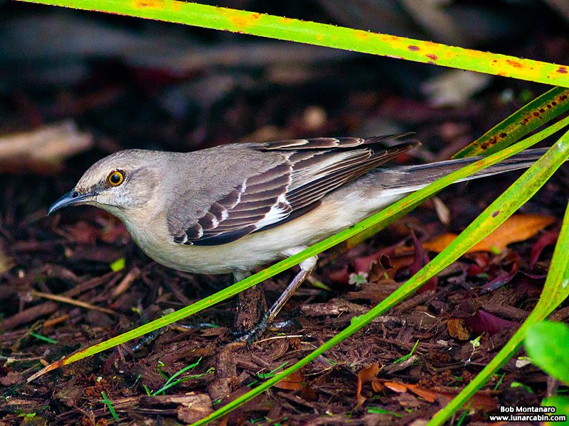 A Northern Mockingbird hunting insects in the shade of a palmetto.