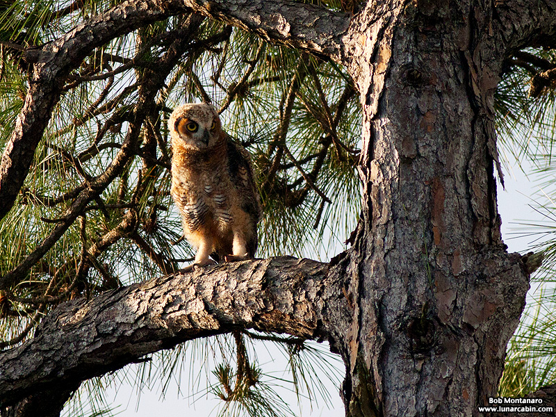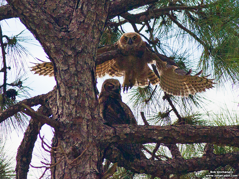 One of the Great Horned Owl young takes to the air for a brief flight among the branches of the pine tree.