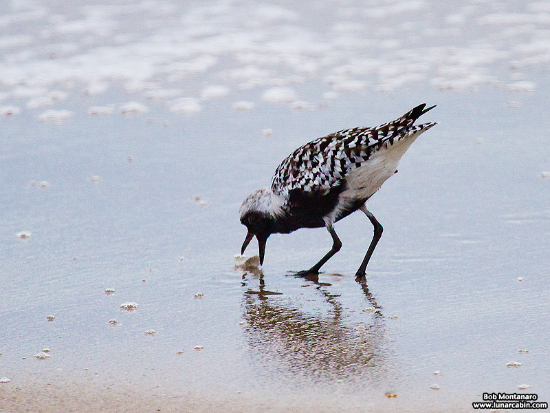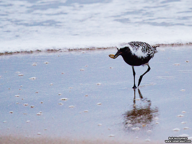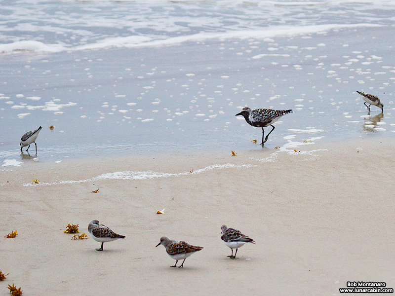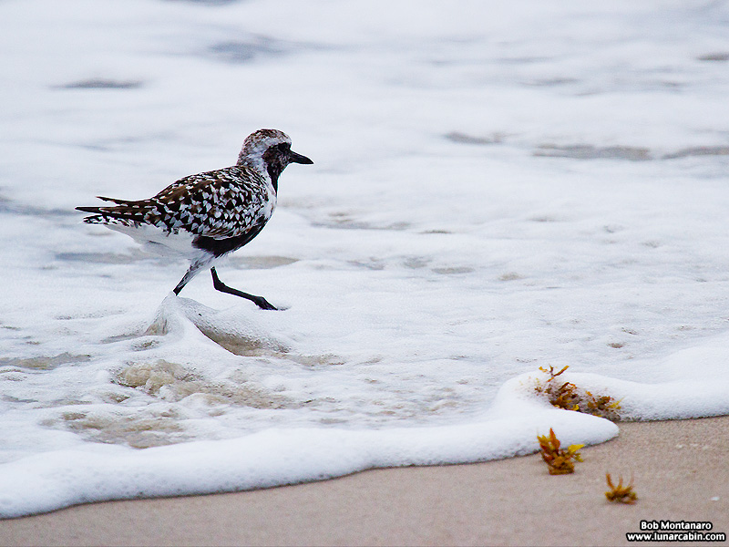 Four Black-bellied Plovers (Pluvialis squatarola) feeding on the beach at the Canaveral National Seashore while dark rainstorms move just offshore. This seems appropriate because the Latin name “pluvia” means rain, while “Pluvialis” implies this is a “rain-bird” though no one seems to quite know what the association is. “Squatarola”, while sounding interesting, actually refers to the Common Plover using the Venetian name that bored ornithologists availed themselves of rather than working at being a little more imaginative. So late in the year, these birds are decked out in their summer breeding plumage and must be a few holdouts waiting to migrate to the far northern tundras of Alaska and Canada where they will nest.