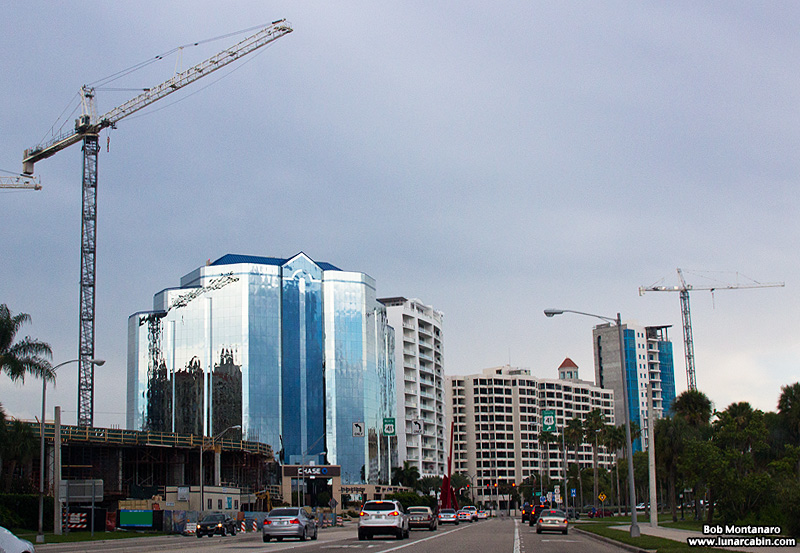 Sarasota office towers and condos along with new construction line the Sarasota Bay shoreline.