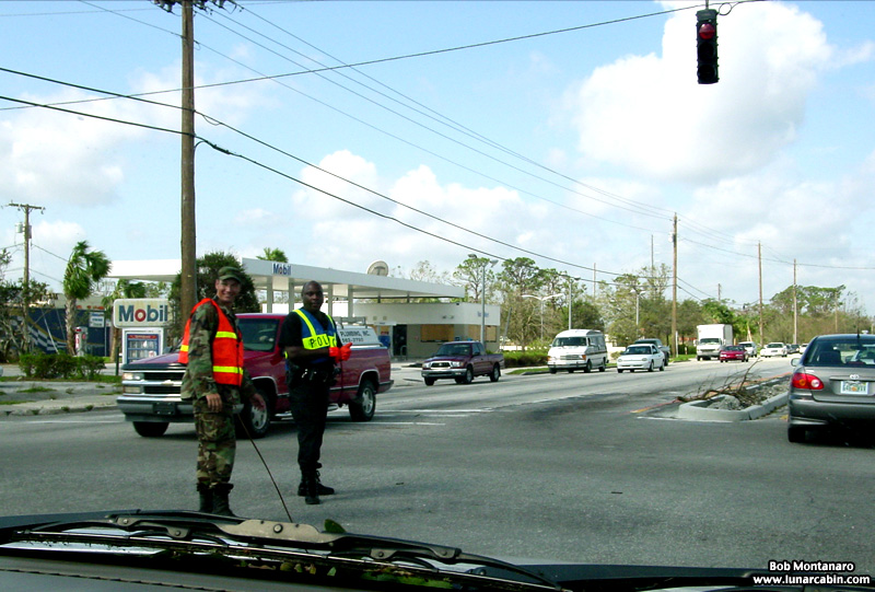National Guard soldier and a police officer direct traffic at the intersection of State Road 60 and 43rd Avenue.