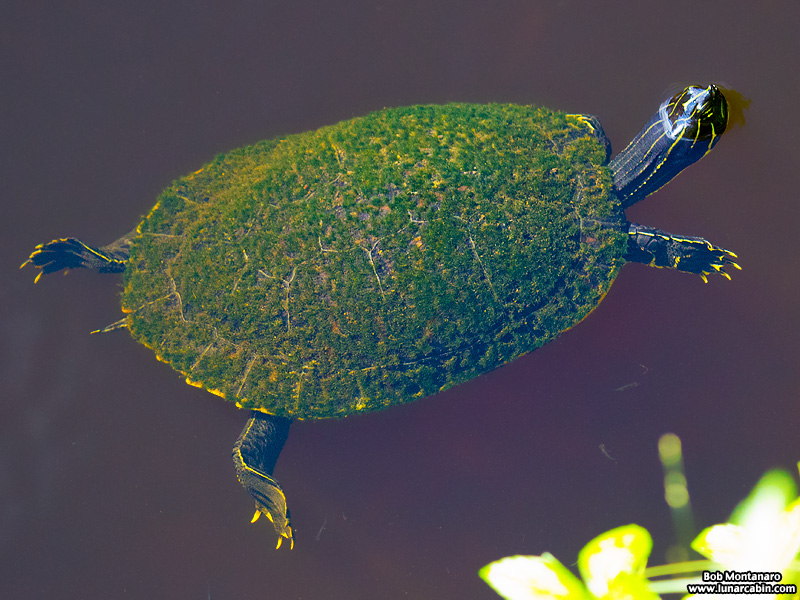 A forest of algae grows on the shell of this Peninsula Cooter.