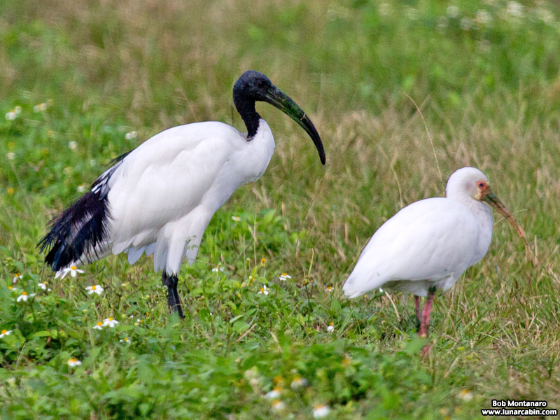 I was thinking my long hike around the wetlands was going to be a bust as I headed back to the vehicle when right in front of me I spied the object of my quest — the Sacred Ibis. The bird was standing right in the middle of the trail! My regret is the dark, overcast sky made photography difficult. Alongside the Sacred Ibis is a White Ibis with a very dirty bill.