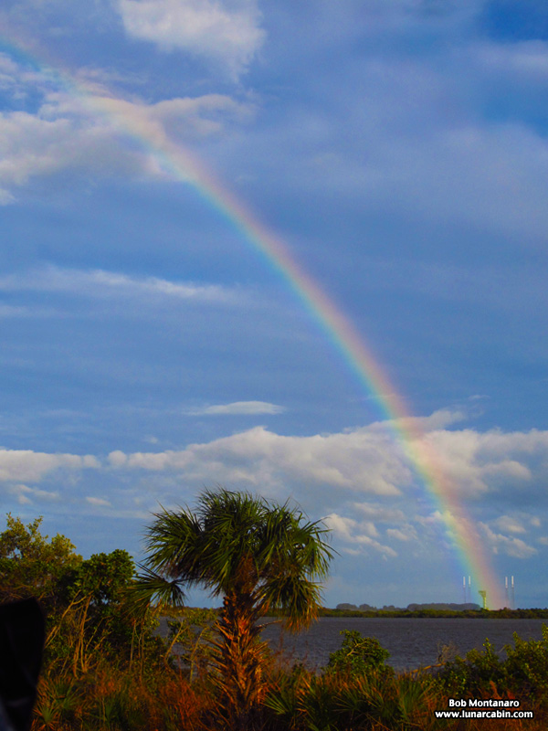 A late February rain shower associated with a passing cold front caused a rainbow to appear at sunset with one end anchored on Space Launch Complex 41 where United Launch Alliance launches the Atlas V rocket. It was quite a sight considering the equally fortuitous conjunction of events to be at the right spot at the right time to catch this fleeting weather event that appears to show the way to the stars from Cape Canaveral Air Force Station.