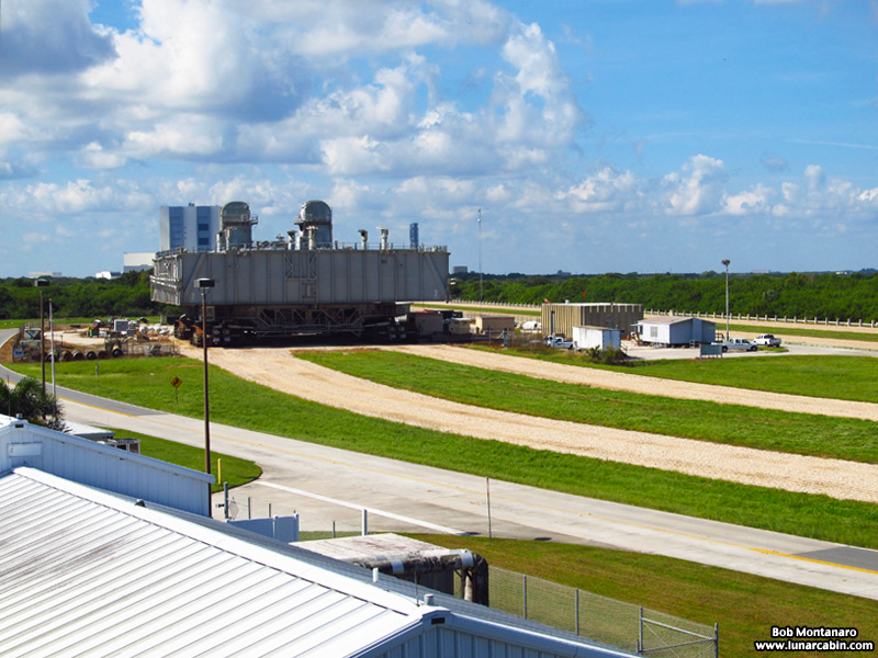 A view of one of the Crawler-Transporters with a Shuttle-era Mobile Launcher Platform upon its back waits patiently in the storage yard to be of use again one day. All these photos were taken from the Launch Complex 39 Observation Gantry, which put one at Vulture-level on the lights.