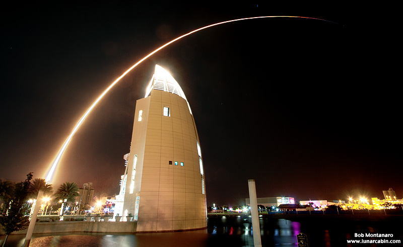 A SpaceX Falcon 9 rocket launched a Japanese communications satellite, JCSAT-14, at 1:21 a.m. on 6 May 2016 from Space Launch Complex 40 at Cape Canaveral Air Force Station. Following stage separation, the first stage of Falcon 9 successfully landed on the “Of Course I Still Love You” droneship positioned several hundred miles offshore in the Atlantic Ocean. The image is a time exposure showing the path of the rocket as it arcs over Exploration Tower at Port Canaveral.