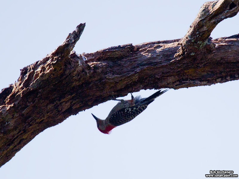 An upside-down Red-bellied Woodpecker. This technique is helpful in finding insects 360-degrees around the branch.