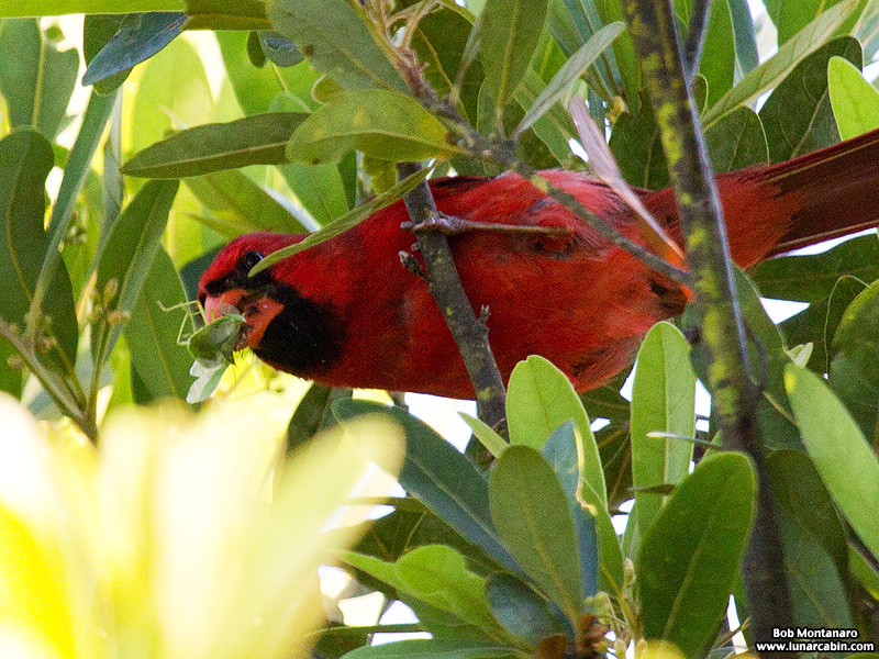 The Cardinal scurried through the foliage to catch an insect seen here in the bird’s bill.