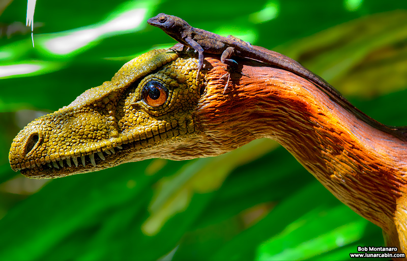 The second modern-day reptile seen was this Anole basking peacefully in the Sun atop this Bambiraptor’s head. The Anole seems fairly unperturbed by the association with its ancient relative.
