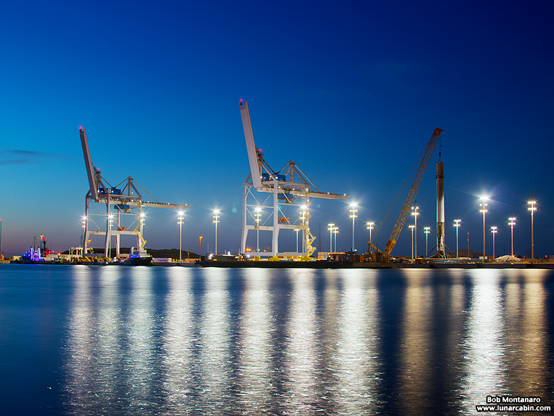 Giant cargo cranes along the waterfront at Port Canaveral look like they are paying homage to the future represented by the SpaceX Falcon 9 booster at right used to launch JCSAT-16. After successfully throwing its second stage topped with the satellite into orbit, the first stage booster powered down to a pinpoint landing on a barge located several hundred miles out in the Atlantic Ocean, which eventually made its way back to Port a few days later with its precious cargo towering overhead. Click to view photos of the launch and of the JCSAT-16 booster in Port.