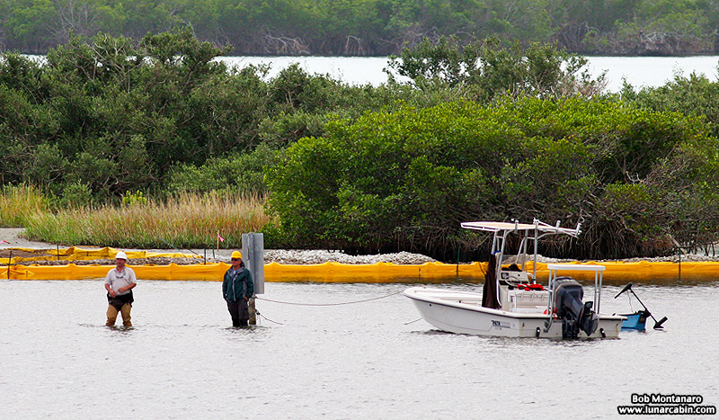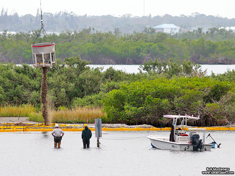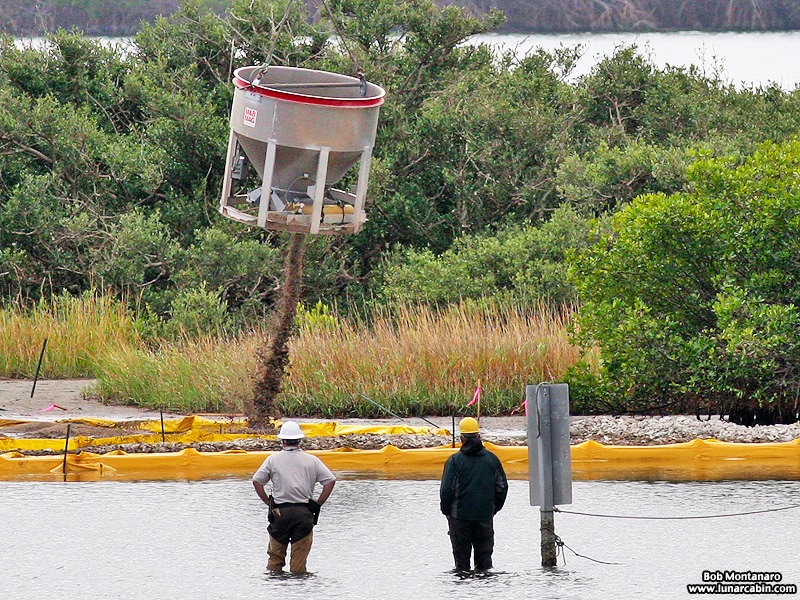 PINWR Manager Paul Tritaik, at left, with the unidentified man wait ready to supervise the dirt’s dispersal onto Pelican Island once the helicopter arrives.