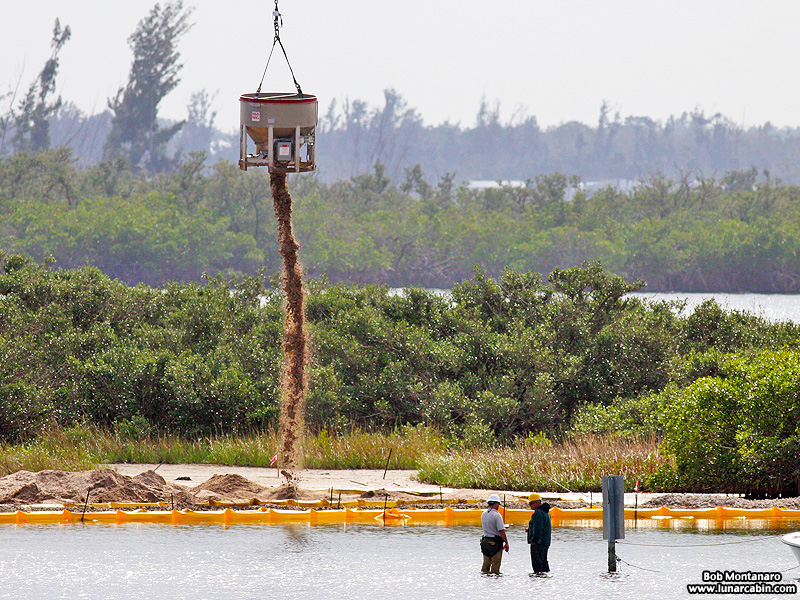 Back when I was a volunteer at Pelican Island National Wildlife Refuge (PINWR) I was fortunate to be invited to watch the expansion of Pelican Island via use of a helicopter flying bucket loads of dirt out to the island. Pelican Island has always been small, roughly 5.5 acres when it first became a bird sanctuary back in 1903. And after years of erosion, most likely caused by a hundred years of boat wakes gnawing at the shoreline, the island dwindled down to a little over 2 acres. This operation back in January of 2006 successfully expanded the size of Pelican Island assisted by the subsequent placement of native plants to stabilize and grow the island a bit over the intervening years. Plus the addition of a wave break has also helped.