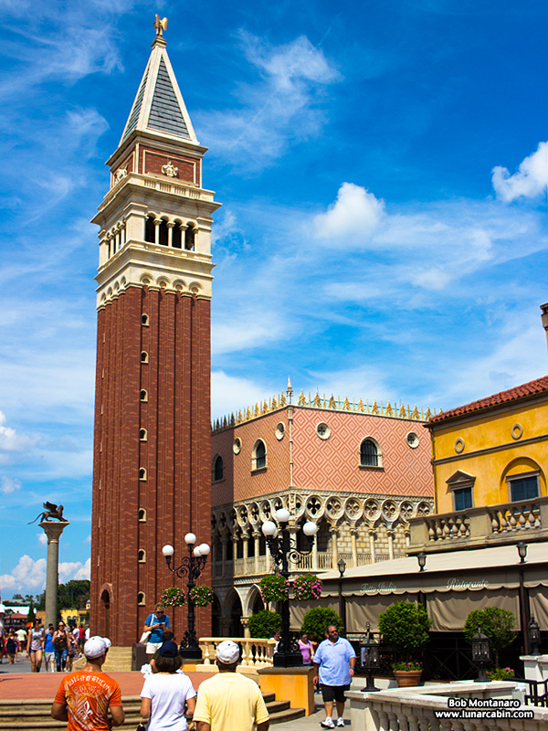 A replica of the St. Mark’s Campanile located in Venice. The original bell tower was built in the 1500s but had to be rebuilt in the early 1900s after the tower collapsed.