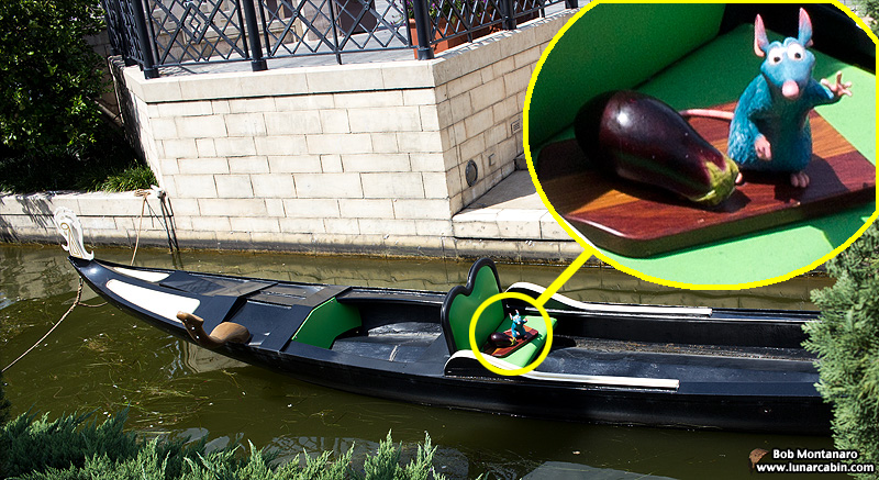 A small network of canals reminiscent of those in Venice, complete with a gondola, front the Italy Pavilion. One of the rat’s from Remy’s Ratatouille Hide & Squeak game was easily viewable in the gondola, appropriately with an eggplant.
