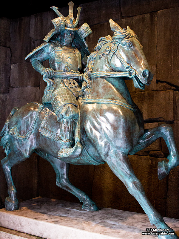 One of the matching pair of Samurai warriors on horseback that flank the entrance to the Japanese castle that houses the large L-shaped Japanese department store.
