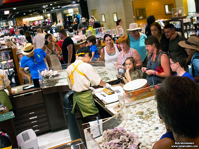A demonstration of how pearls are found in clams draws a crowd.
