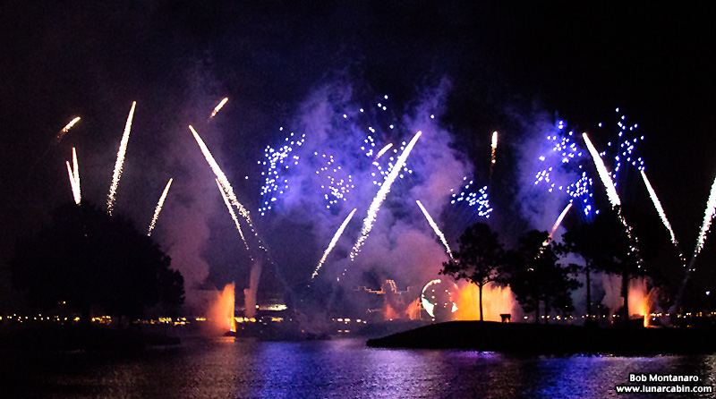 Below starts the IllumiNations show as viewed from a waterside seat on the patio of the Spice Road Table restaurant in the Morocco Pavilion.