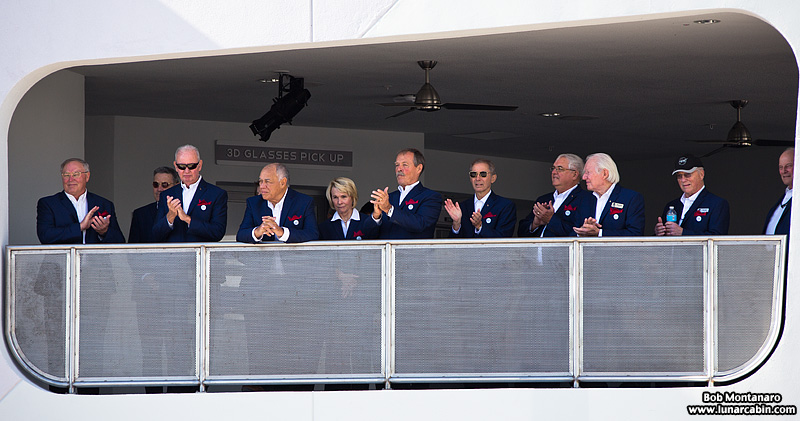 A close-up during the National Anthem showing at left Rick Abramson, executive vice-president and chief operating officer of Delaware North, the company that runs the Visitor Complex for NASA. In the center is John Zarella in his distinctive red jacket. And, finally, vice-president and general manager of Boeing Space Exploration John Elbon. Boeing is a sponsor of the new exhibit.