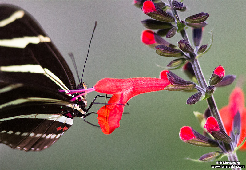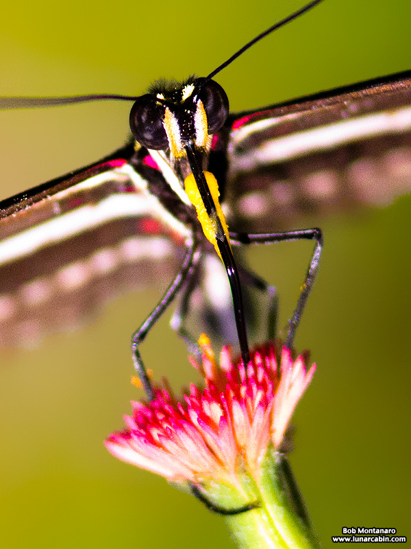 A few photos of a Zebra Longwing butterfly in the Audubon House pollinator garden at the Oslo Riverfront Conservation Area in Indian River County, Florida. Aside from the butterfly’s flighty nature, these images were also hampered by a brisk wind blowing the butterfly in and out of frame when it alighted on a plant. In the image below note the large clumps of yellow pollen sticking to the butterfly’s proboscis as it probes a flower for nectar and pollen. According to the University of Florida Institute of Food and Agricultural Sciences, “Adult Zebra Longwing butterflies feed on both flower nectar and pollen. The additional nutrients from the pollen enable individuals to survive for several months, far exceeding the normal two to four week adult life span of most other butterflies.”