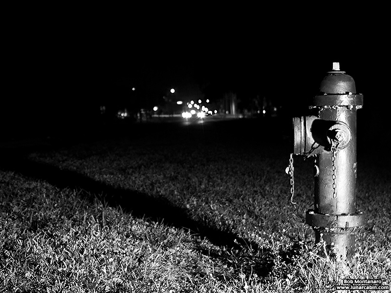 The melancholy Oslo Road fire hydrant sits in darkness every night, far from the light and activity of the distant intersection.