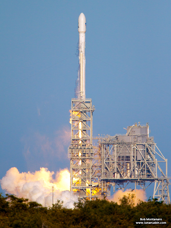 The SpaceX Falcon 9 rocket is not quite clear of the tower yet in this photo from the 30 March 2017 launch of the SES-10 satellite. Lots of reusable items here, including the old shuttle launch pad getting a new lease on life with SpaceX, and the Falcon 9 first stage, which flew once before less than a year ago and is now proving it can do it again.