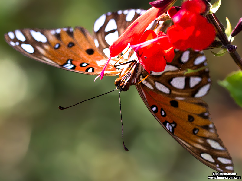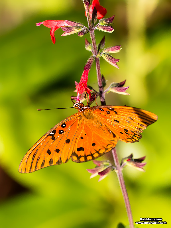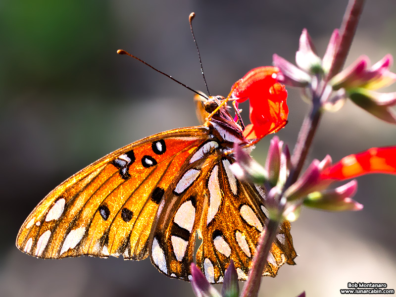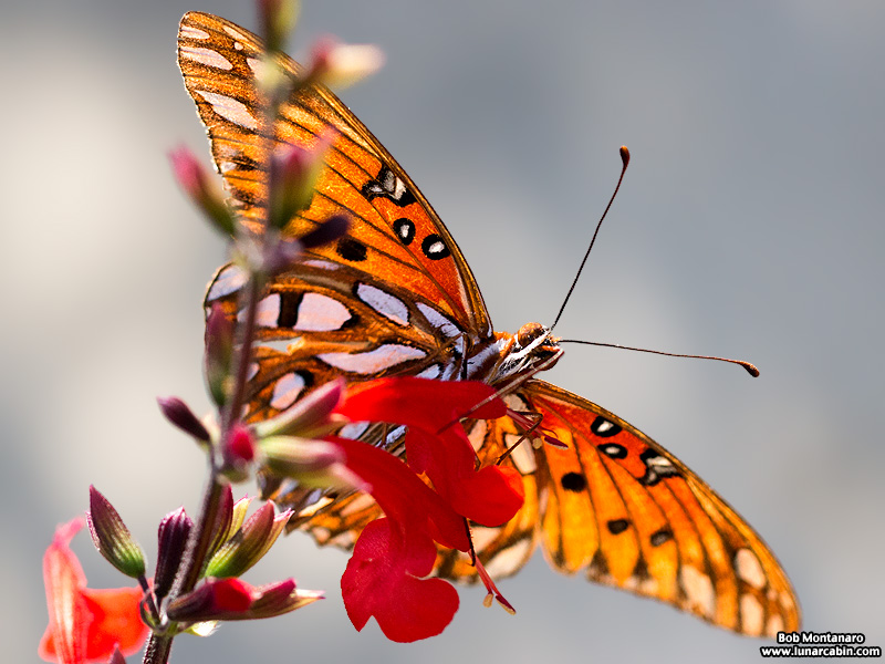 A Gulf Fritillary makes the breakfast rounds in the first light of the day in the pollinator garden at Audubon House. In many of these images the wings are backlit by the Sun highlighting their scales, which give a grainy appearance to the wings.