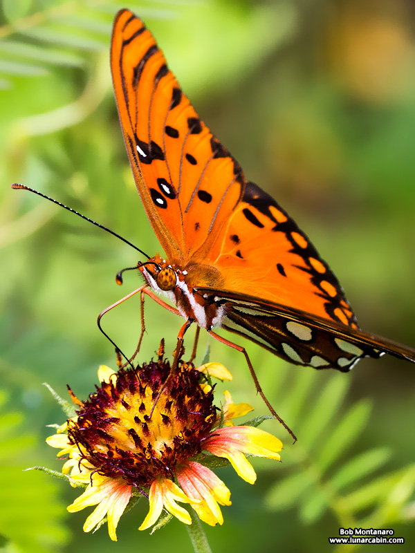 A lone Gulf Fritillary takes nourishment after surviving severe storms that passed over the Audubon House pollinator garden during the late afternoon.