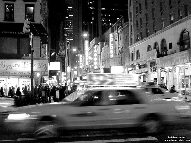 From a trip to New York City in the winter time. The lighted theater marquees, the bundled-up crowds, and the passing taxis say it all.