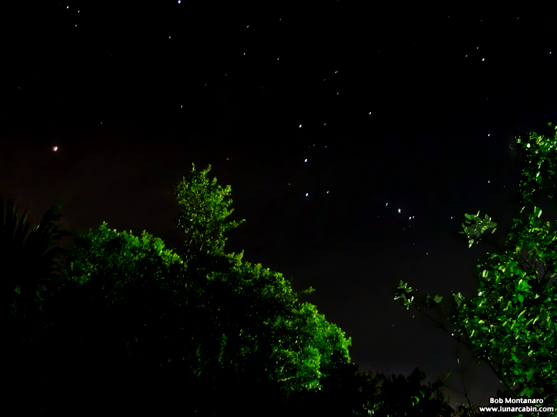 Living in Florida, there sometimes appears to be only two seasons. One hot, and one not-so-hot. Sadly, the not-so-hot season, which normal people in other places call winter, is all too short. Great masses of cold air fighting their way southward down from the Arctic usually peter out before they can cross the state line, let alone making it halfway down the peninsula to cool all the hotheads clinging desperately to the paradise fantasy. As I am constantly looking up toward the heavens as I roll my eyes at the latest travesty, my eye is drawn every year to the constellation of Orion the Hunter, whose presence high in the sky overhead portends, for humans in the Northern Hemisphere, at least, that winter is upon us. This time of shorter, cooler days and long nights is eagerly anticipated after the tediously hard slog through summer, and it is at the end of summer when Orion finally peeks over the horizon to announce change is coming. I eagerly anticipate that first sighting every year and, with it, the hope of cooler days – and today was the day! Around 5:00 a.m. this 12 August 2017, on a short jaunt with my faithful companion through the backyard, there was Orion low in the east just above the trees. It was a glorious and much appreciated sight as seen in this hasty photograph taken in the dewy darkness!