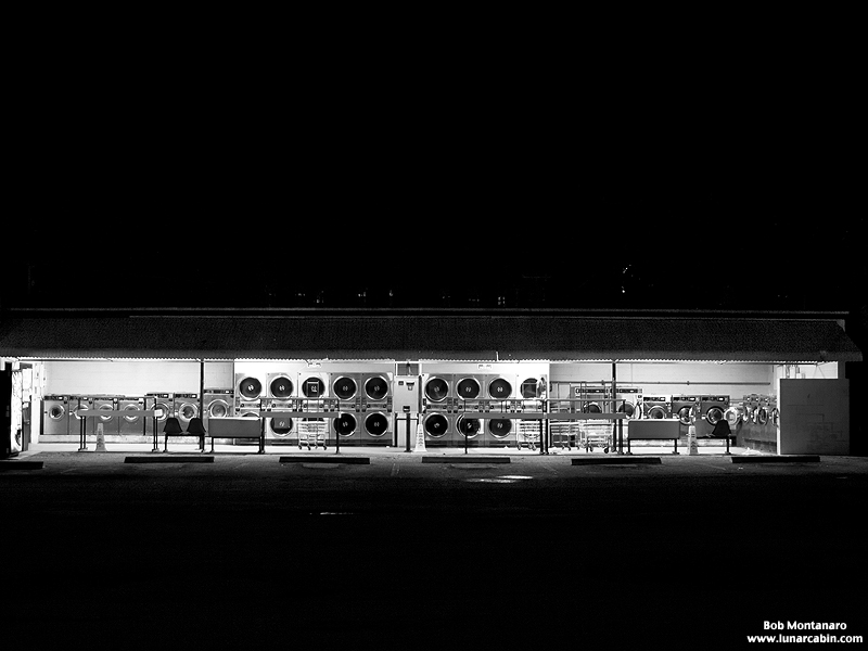 As bizarre as it sounds, it took over a month to get this photo of the deserted laundromat at night. You would be surprised as how many people do laundry at 3 or 4 in the morning, which to me sounds like the time it would have been sans launderers, but to no avail. So it would not be time of night that found the popular place empty, but luck. Late this past Saturday night, something nagged at me to take a detour as I trundled home to go by and see how it looked. As I pulled up, I saw a lone family loading the last of their laundry into their car and then pulling away finally leaving the place deserted. The photo came out as expected. The laundromat floating in a sea of darkness, the only illumination coming from its own interior. It might as well be on the Moon.