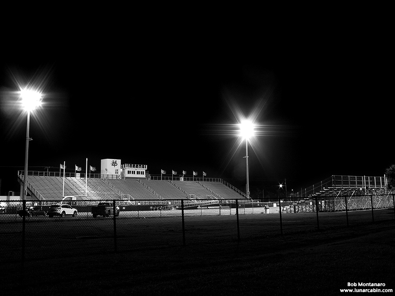 The Citrus Bowl, the home of the Vero Beach High School Fighting Indians, seen late on a post-game Friday night. Many years ago, citrus was king in Indian River County. Now, it is more of a distant relative. The onetime importance of this particular fruit lent its name, rather opportune at the time and not without some humor, to the local football stadium. In keeping with the whole ambience, the team should have been called the “Fruit Pickers” or some such, rather than the “Fighting Indians”. Regardless, the place fills up with fans on Friday nights during the high school football season. The flags above the bleachers, by the way, spell out “Vero Beach”.