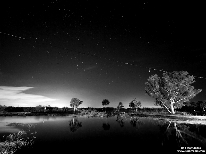 Orion the Hunter and other winter constellations rise in the east over the St. Johns River as seen from James G. Bourbeau Memorial Park in Brevard County. The St. Johns River at this location is a wide, marshy floodplain filled with sawgrass, alligators, and other wildlife. On the night I was there an airboat in the distance made its way slowly through the sawgrass marsh with bright lights being waved around the boat into the surrounding marsh in hunt of something. Note the fishing tackle caught on the power line.
